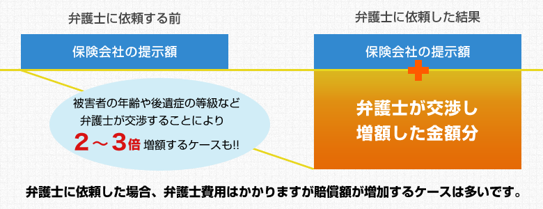 保険会社は自賠責保険基準に近い賠償額を提示してくることが多いのですが、弁護士は裁判所基準で示談交渉するため、提示された金額から2〜3倍以上に増額するケースがあります。