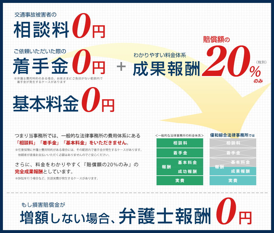 また着手金も無料です。費用のお支払いは示談金を受け取った後でも可能です。さらに、弁護士費用特約(※)の利用で弁護士費用の心配もありません。お気軽にご相談ください。
